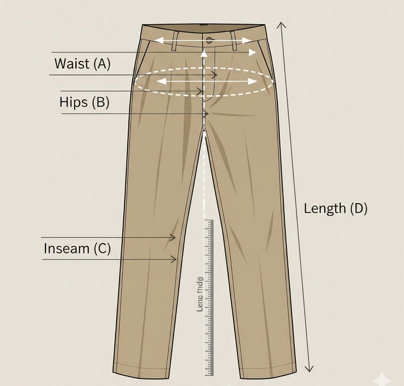 Hips: Measure straight across the widest part of the pants, usually about 20cm down from the top of the waistband.